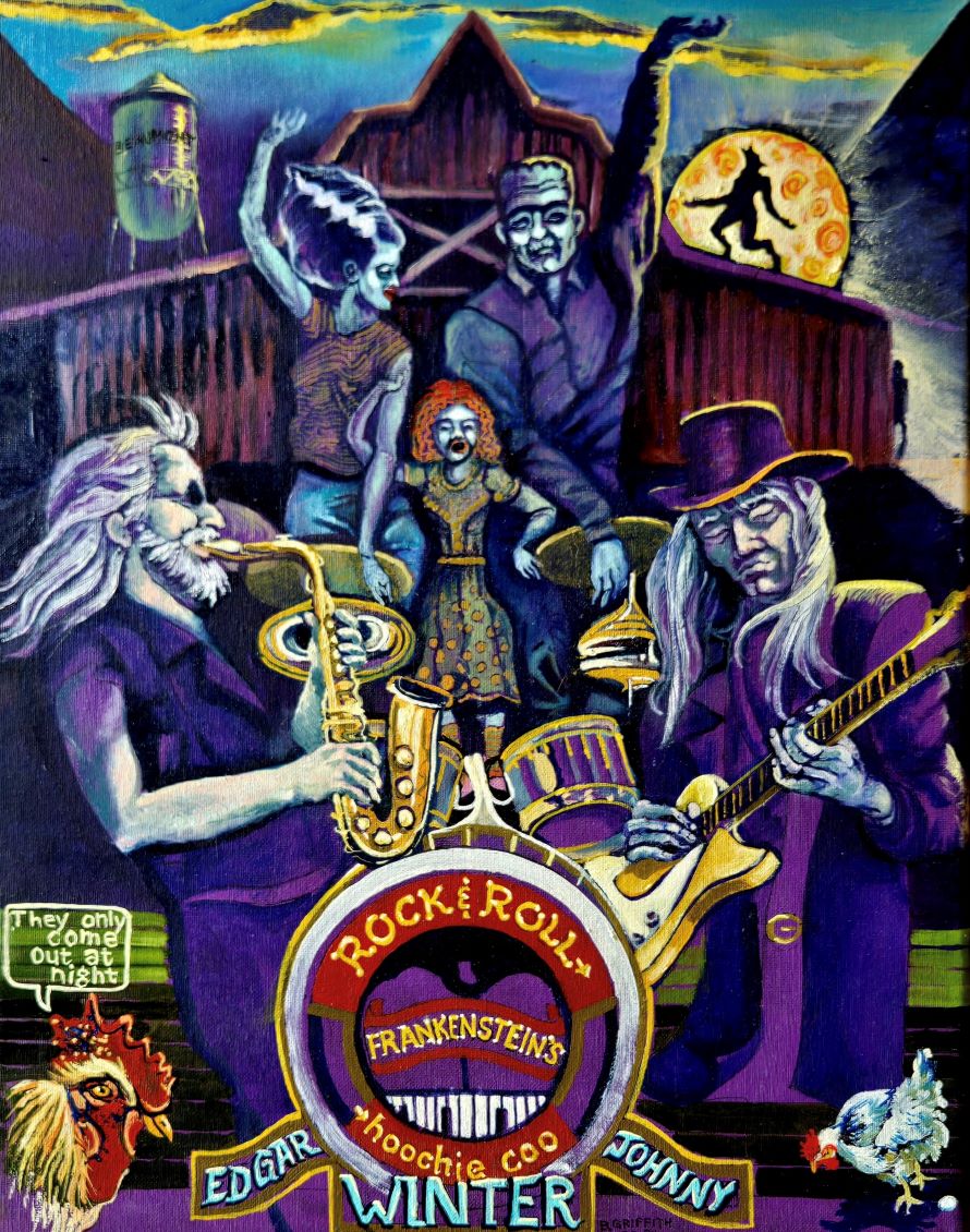 FRANKENSTEIN'S ROCK & ROLL HOOCHIE KOO AS PERFORMED BY EDGAR & JOHNNY WINTER18" X 24"Oil on canvas.$900