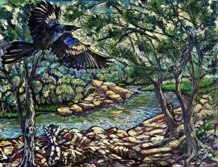 GRACKLE OVER INKS LAKE21-1/2" X 17-1/2"Plein air oil on canvas.$425